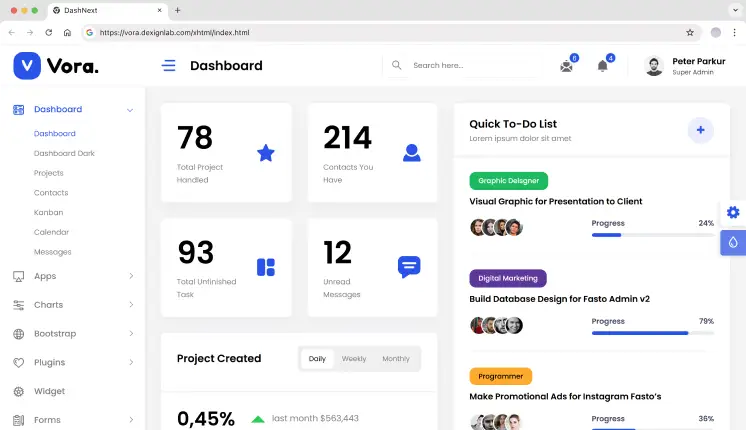 Vora is an HTML-based SaaS dashboard template used when teams need analytics dashboards without committing to a frontend framework. It works best for server-rendered reporting tools and backend-driven analytics where the UI layer stays thin.